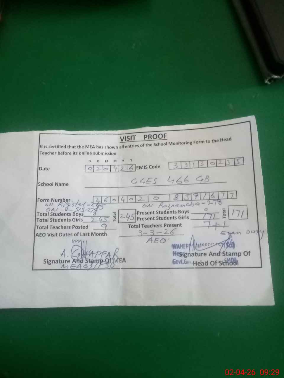 | Attendance Register | Head Teacher | MEA with School | Visit Proof |