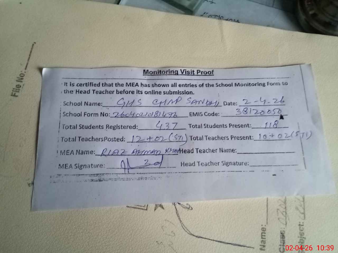 | EMIS Code: 38120050 | Name of School: GHS CHAP SANDI | |||