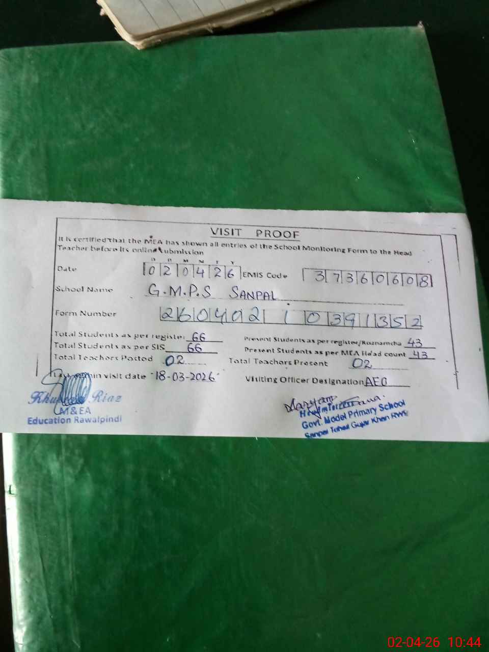 | Attendance Register | Head Teacher | MEA with School | Visit Proof |