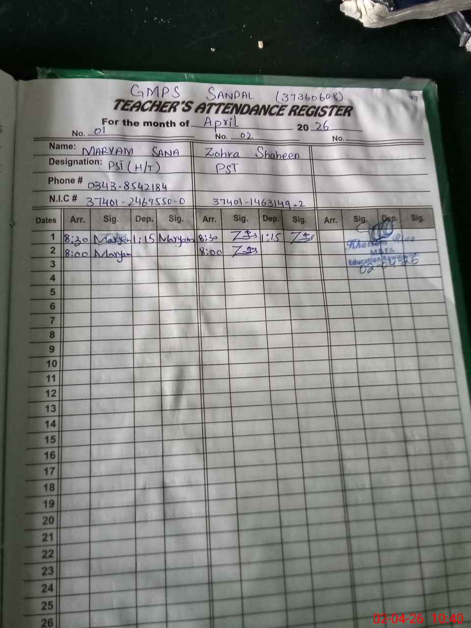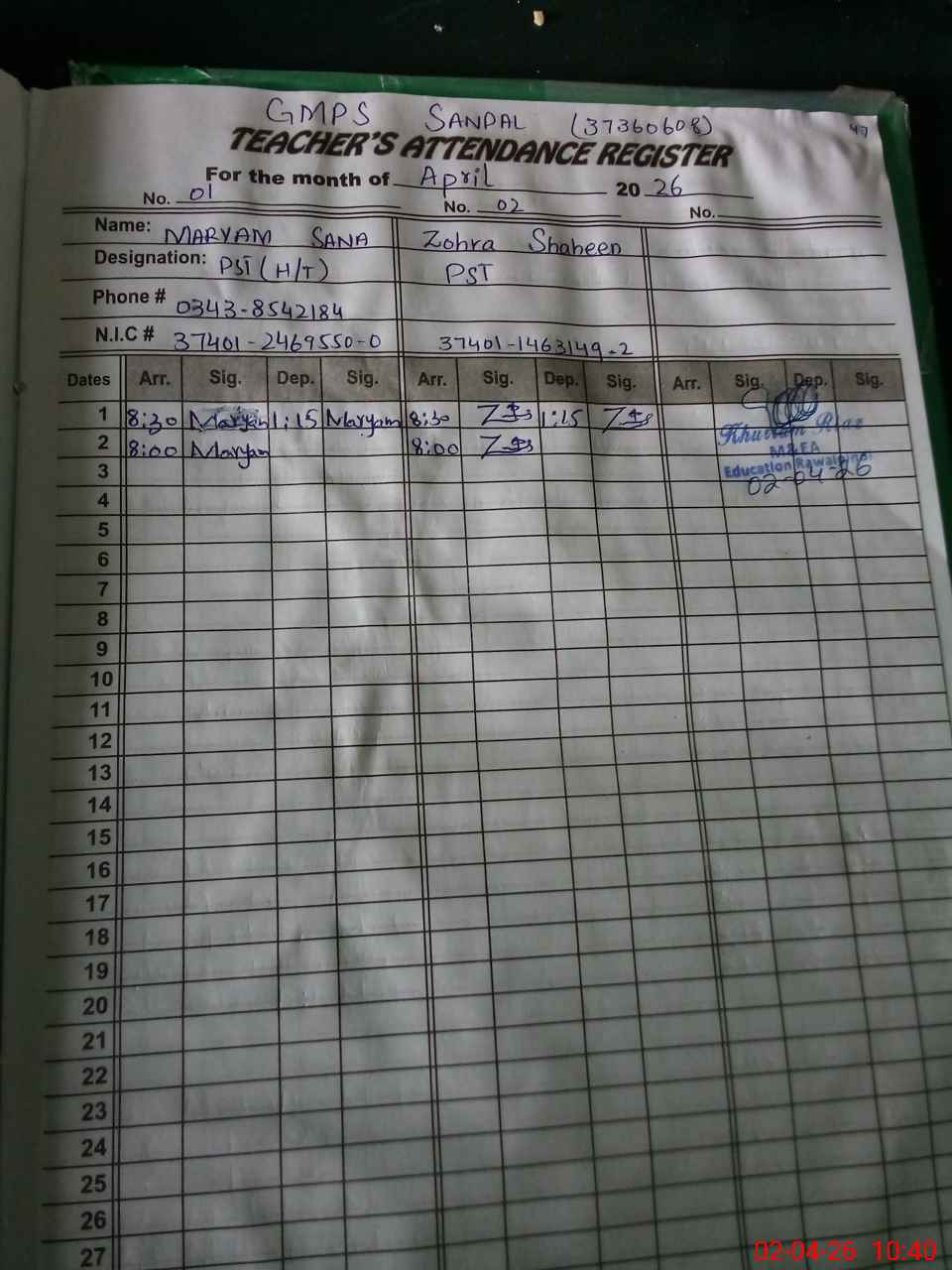 | Remarks (Use Separate Page if Required): teachers Zohra Shaheen is locally attached to this from GGES CHAK DOULAT | |||||
