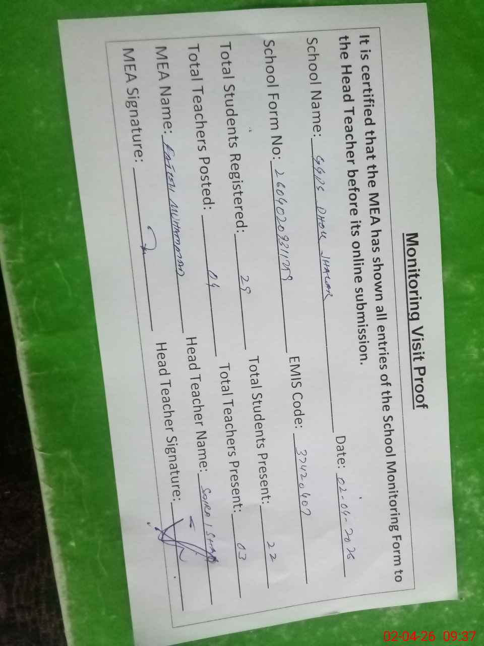 | Attendance Register | Head Teacher | MEA with School | Visit Proof |
