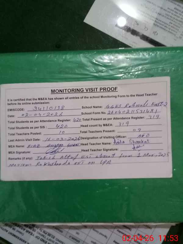 | Remarks (Use Separate Page if Required): Students Attendance Registers are not updated at the time of visit Tabish Altaf EST absent from her duty w e f 01 Mar, 2025 Mariam Rukhshanda SST is on LPR Data as per provided by School Staff and found during physical visit | |||||