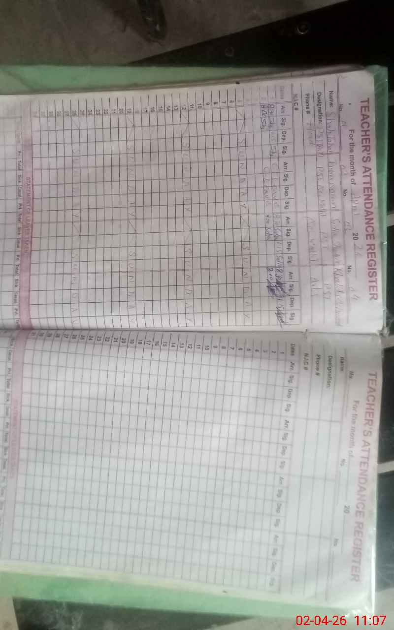 | Remarks (Use Separate Page if Required): There is No Electricity since last 04 Week in the sub campus where no water found its toilet non functional FTF RECORD NOT FOUND IRUM NOREEN PST LEAVE RECORD NOT SHOWN TO MEA SO UNAUTHORIZED ABSEffNT | |||||