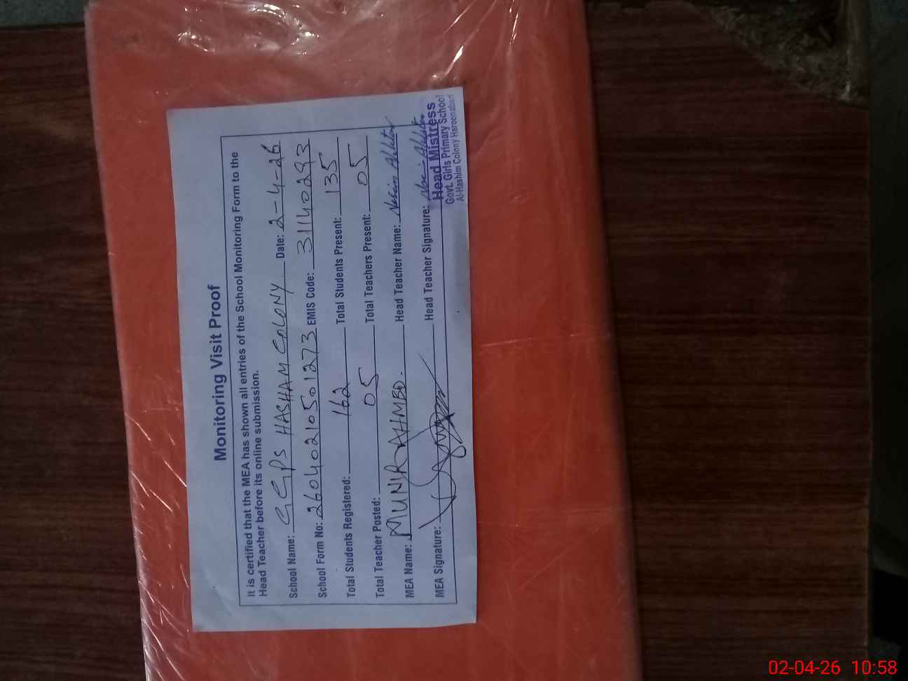 | Attendance Register | Head Teacher | MEA with School | Visit Proof |