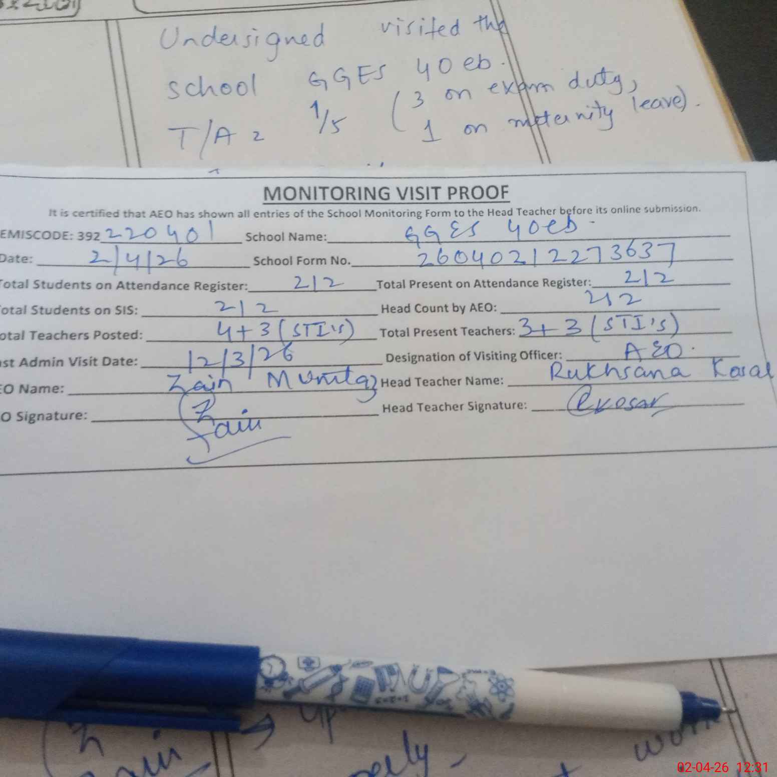 | Attendance Register | Head Teacher | MEA with School | Visit Proof |