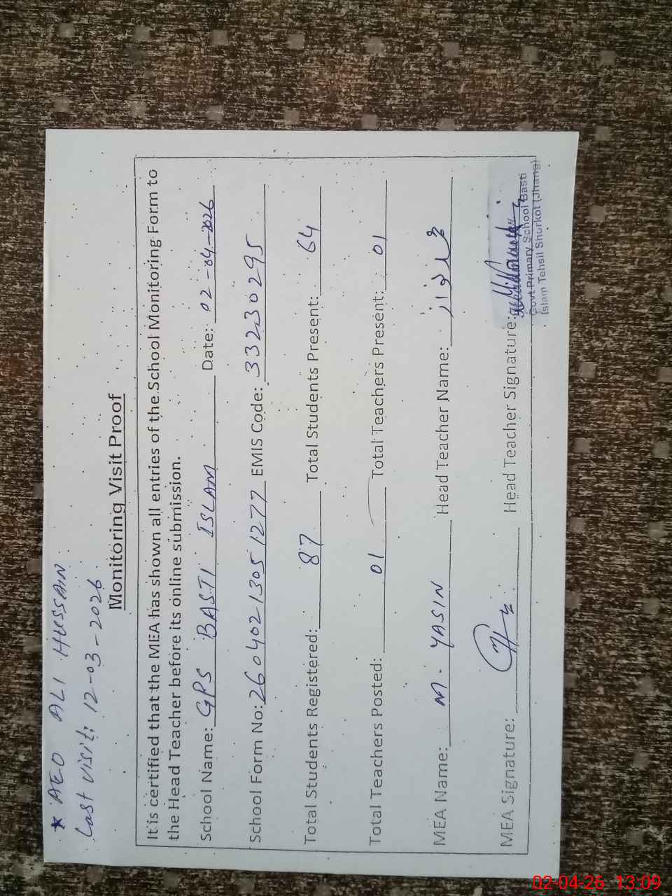| Attendance Register | Head Teacher | MEA with School | Visit Proof |