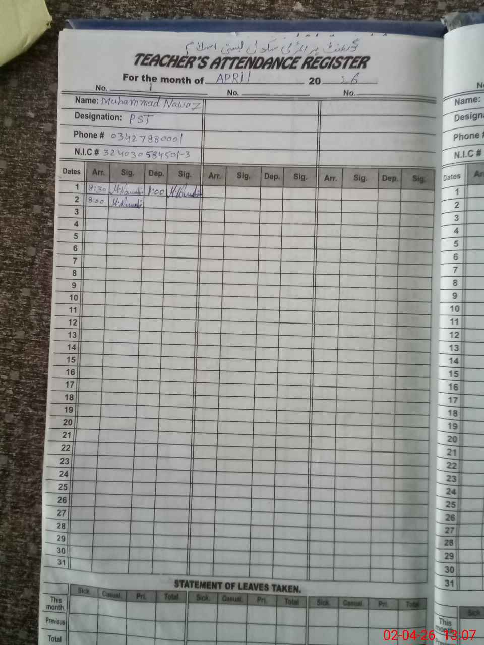 | CNIC | Full Name | Designation | R/C | Absence During Last Calender Month |