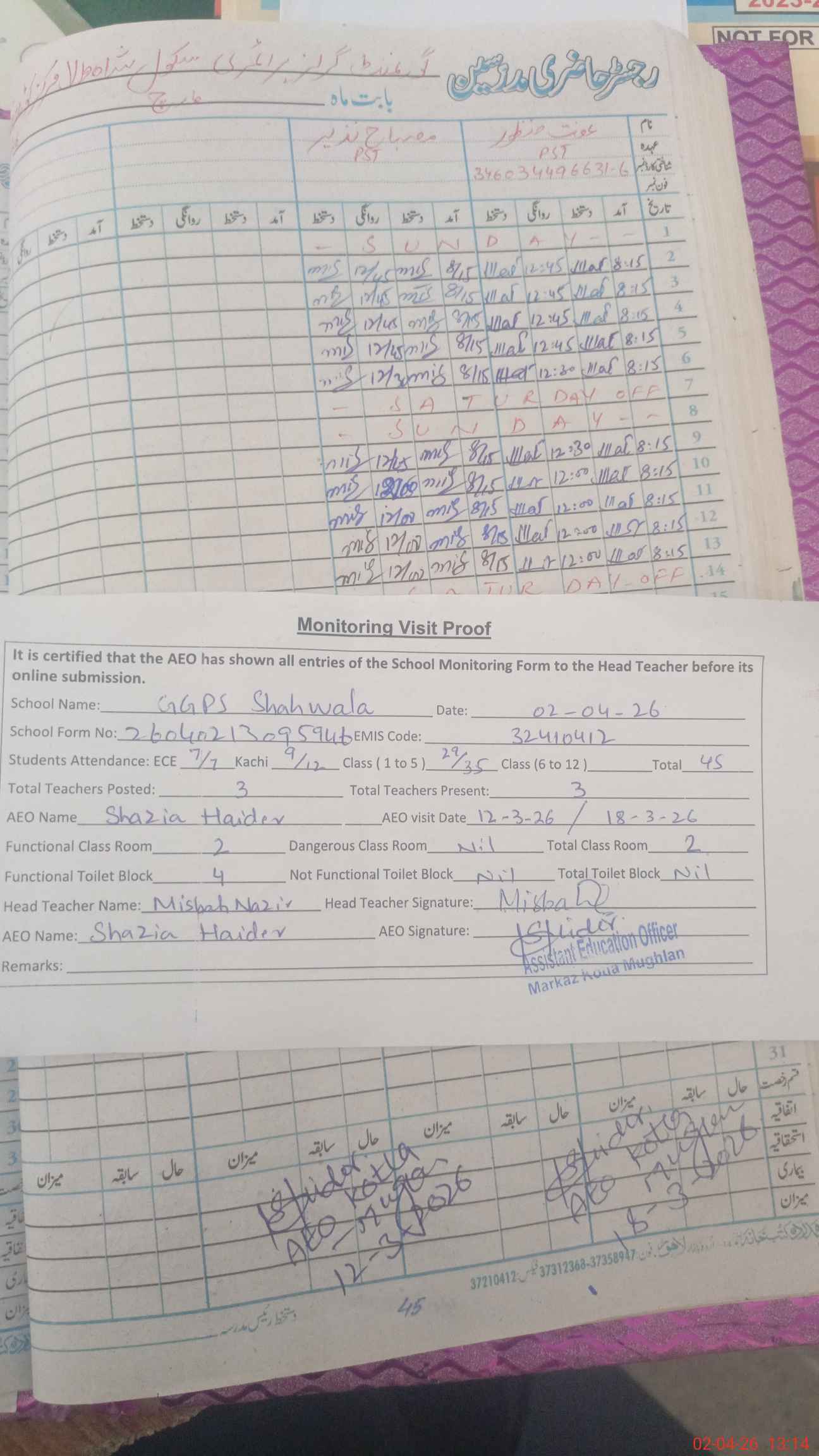 | Attendance Register | Head Teacher | MEA with School | Visit Proof |