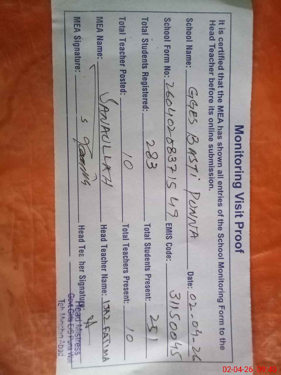 | Attendance Register | Head Teacher | MEA with School | Visit Proof |