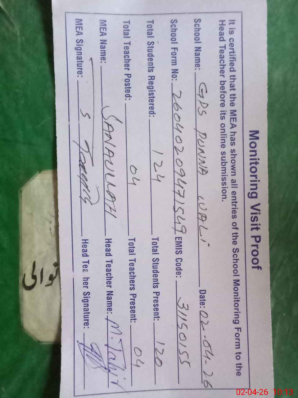 | Attendance Register | Head Teacher | MEA with School | Visit Proof |