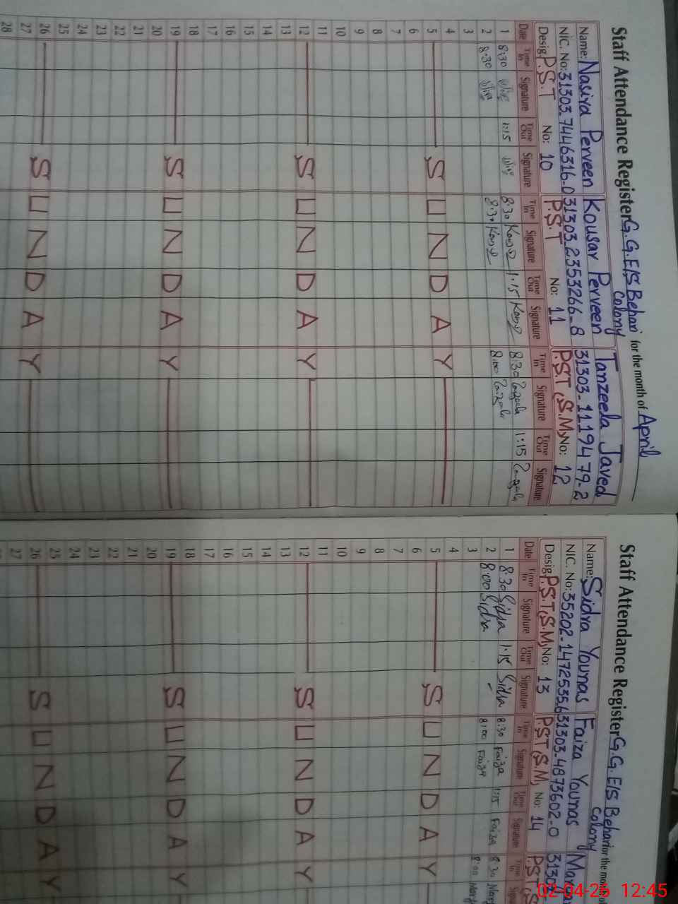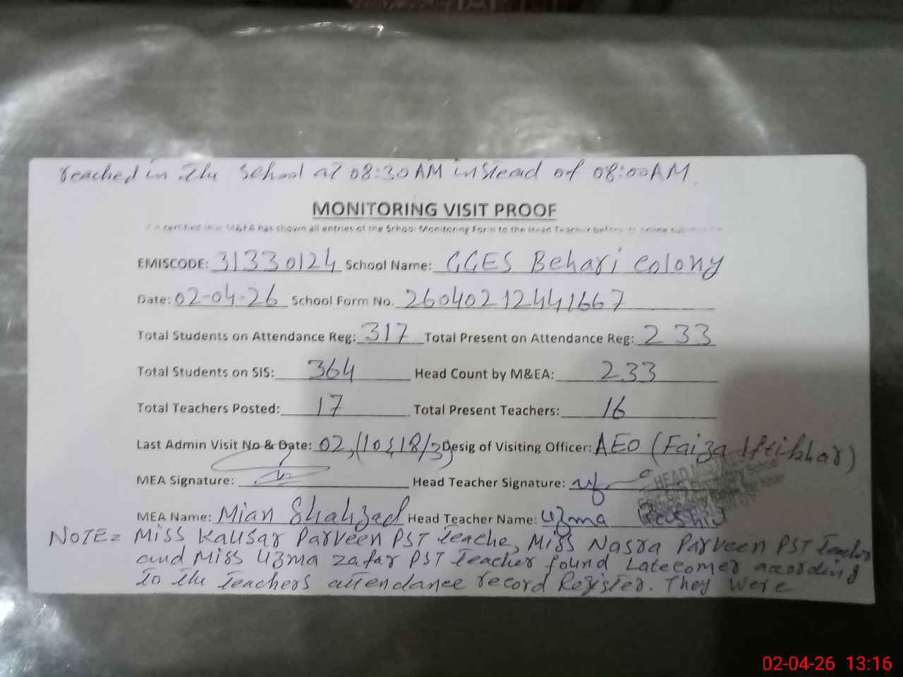 | Remarks (Use Separate Page if Required): Miss Kausar Parveen PST teacher, Miss Nasra Parveen PST teacher and Miss Uzma Zafar PST teacher found latecomer according to the teachers attendance record register. They were reached in the school at 08:30 AM instead of 08:00 AM. | |||||