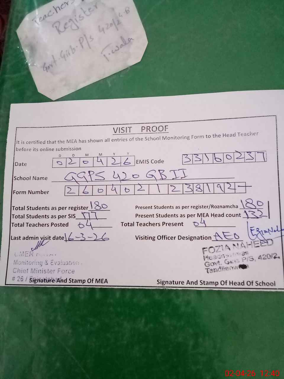 | Attendance Register | Head Teacher | MEA with School | Visit Proof |