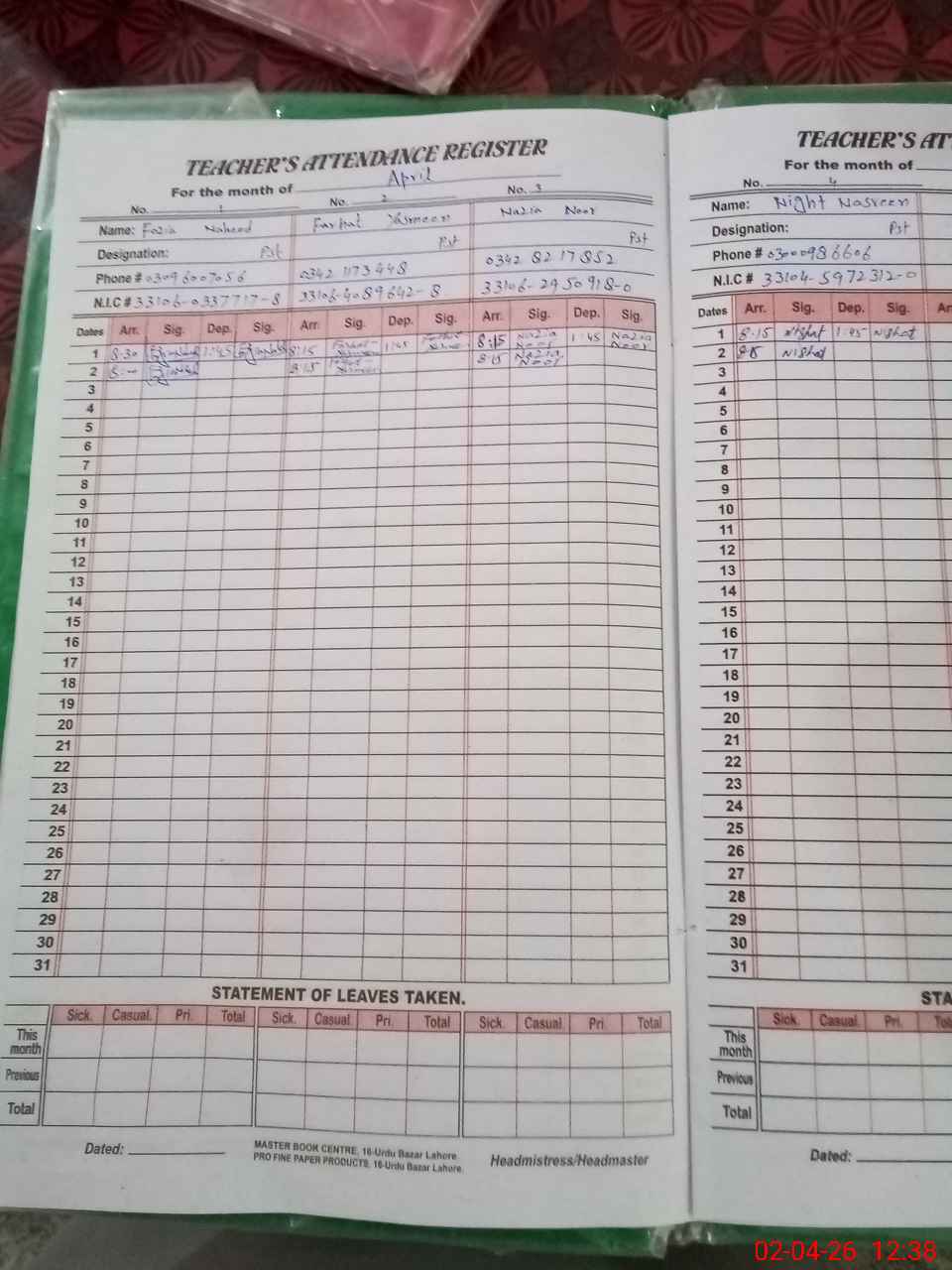 | CNIC | Full Name | Designation | R/C | Absence During Last Calender Month |