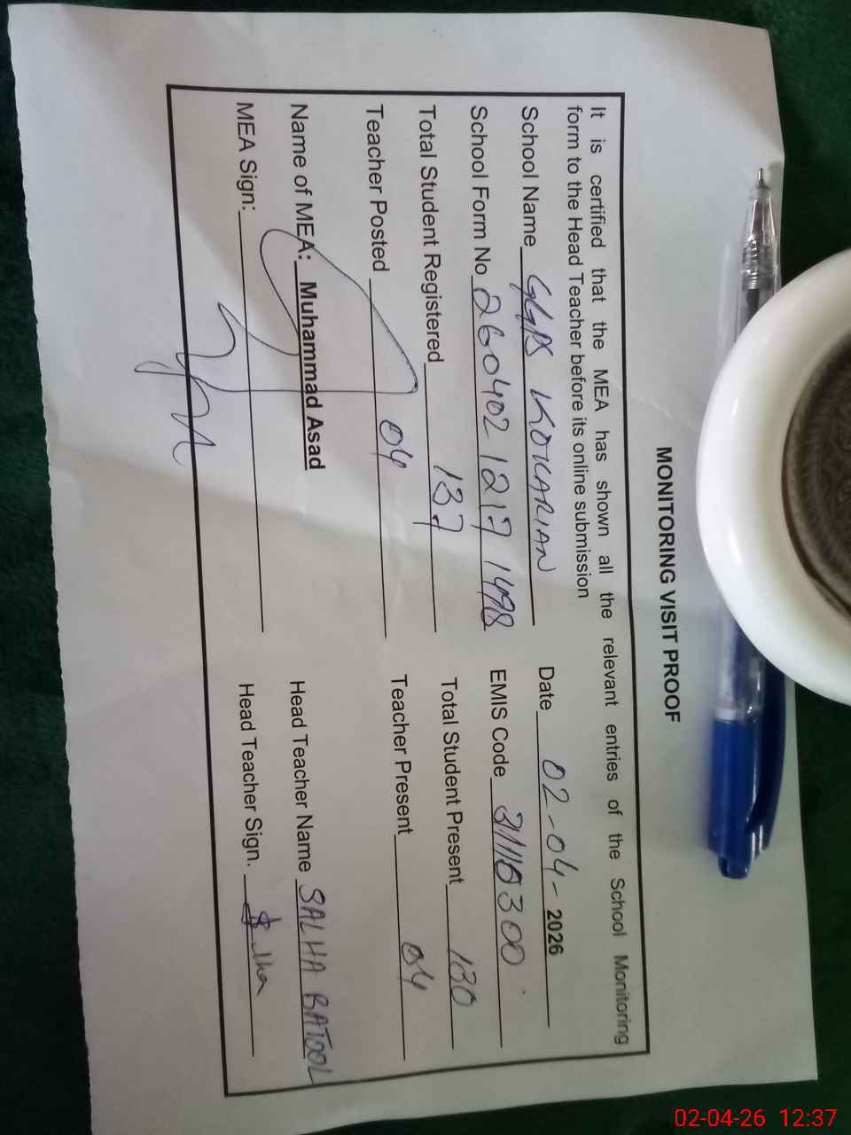| EMIS Code: 31110300 | Name of School: GGPS KOKARAN WALI | |||
