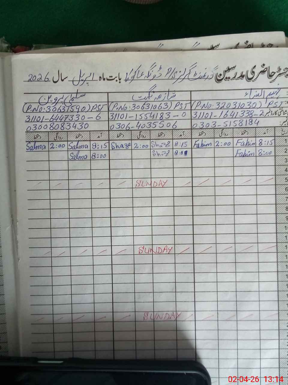 | CNIC | Full Name | Designation | R/C | Absence During Last Calender Month |
