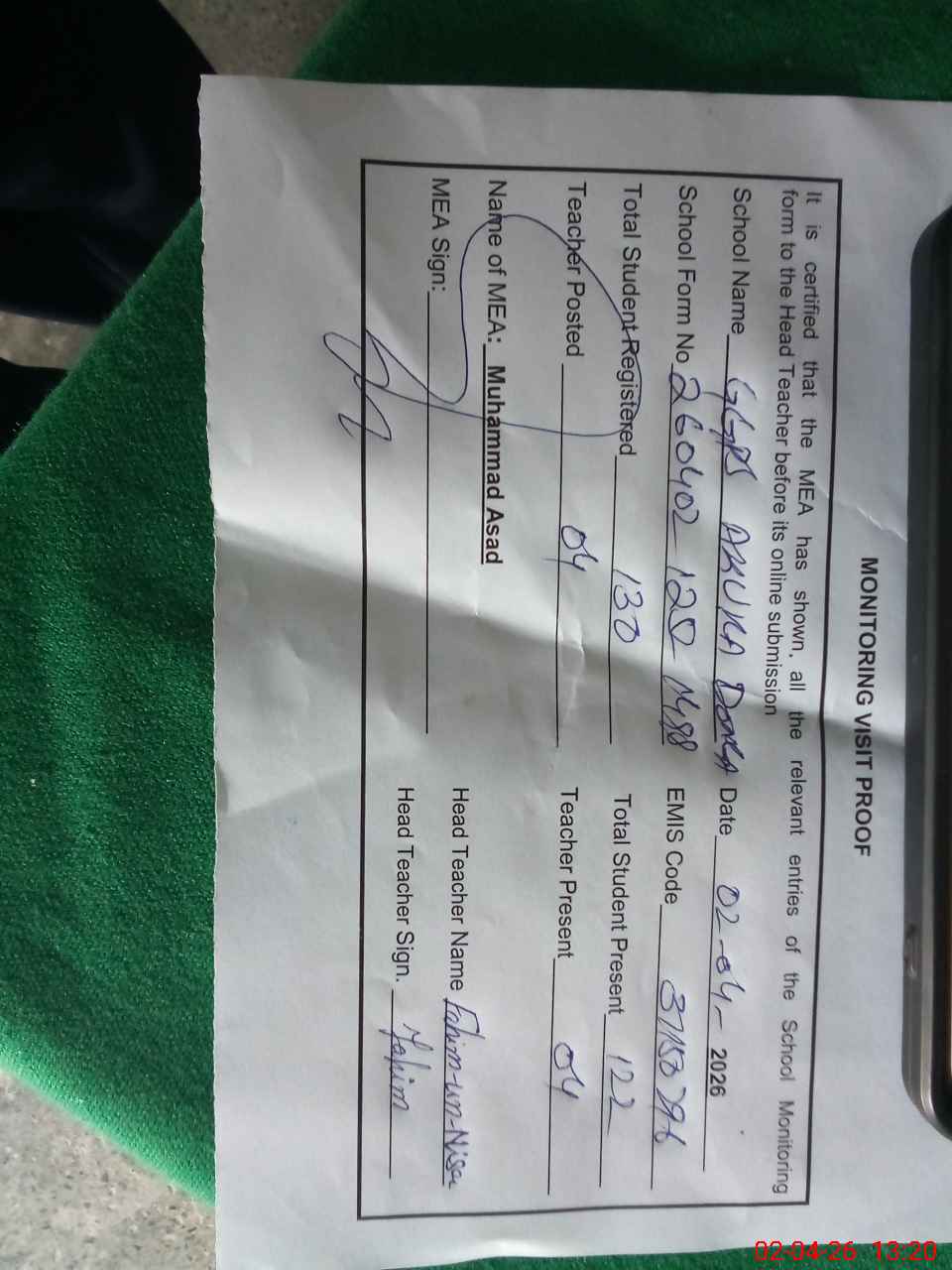 | Attendance Register | Head Teacher | MEA with School | Visit Proof |