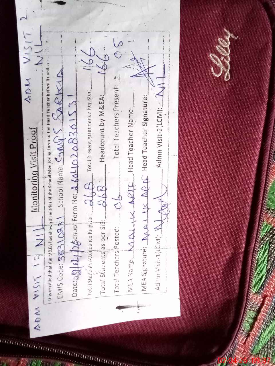 | Total no. of Classrooms: 6 No. of Classrooms Used for Teaching: 4 No. of Classrooms Storing Old Furniture, FTBs, etc: 0Comments if Any: Drinking water not available in the school arranged from other sources Teacher Rabia Zulfiqar marked as absent as no proof of leave shown D 3 FORM of old academic year available however New one not available. Boundary Wall partially functional due to lo |