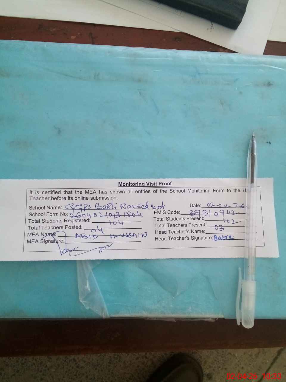 | Attendance Register | Head Teacher | MEA with School | Visit Proof |