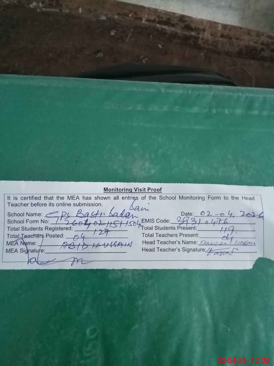 | EMIS Code: 39310476 | Name of School: GPS BASTI SADAN SAIN | |||