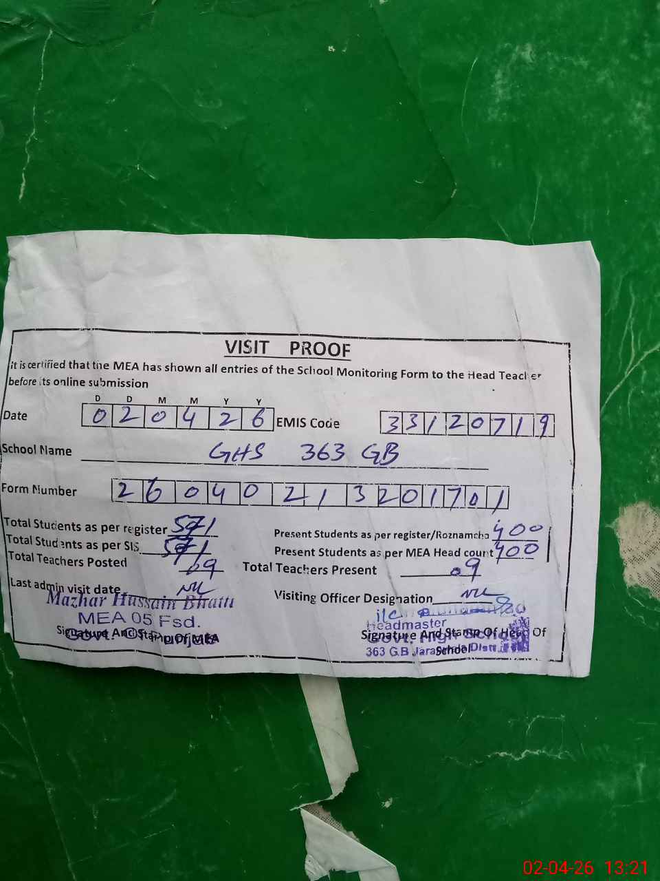 | EMIS Code: 33120719 | Name of School: GHS CHAK NO 363 GB | |||