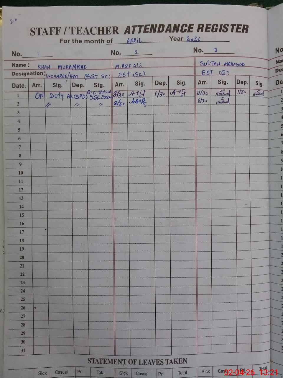| 33**** | Ka**** Ah**** Kh**** An**** | EST General Arts | Regular | 0 | 0 | 0 | 0 | 0 | 0 | 0 | 0 | 0 | Exam Duty |