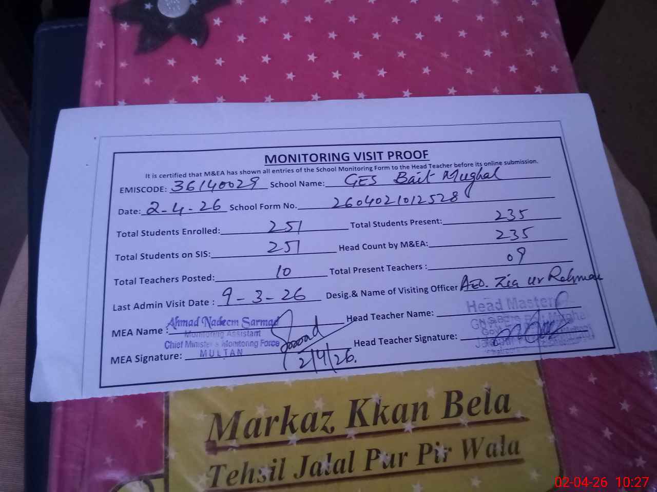 | EMIS Code: 36140029 | Name of School: GES BAIT MUGHAL BASTI DE-WALA | |||