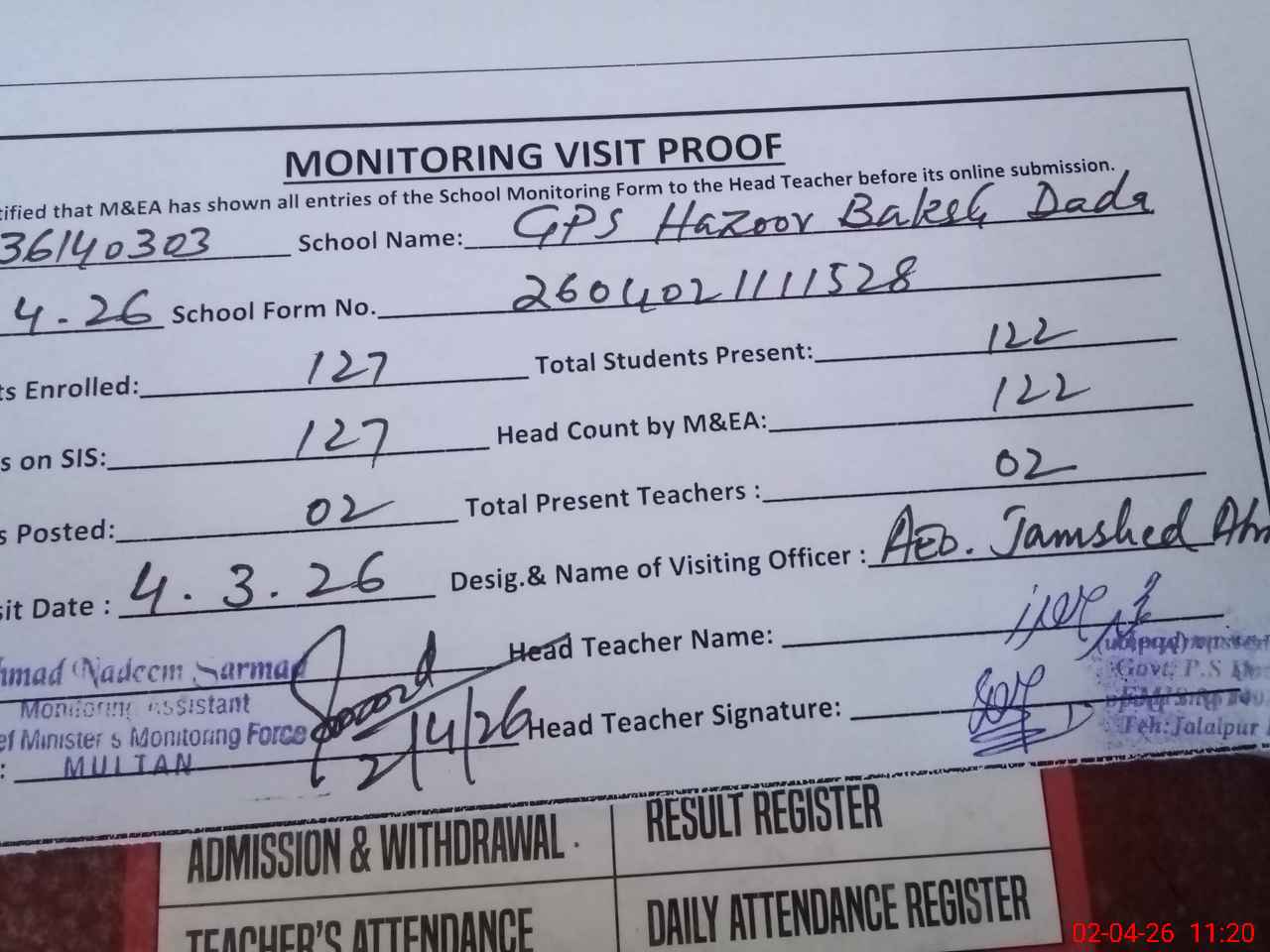 | Attendance Register | Head Teacher | MEA with School | Visit Proof |