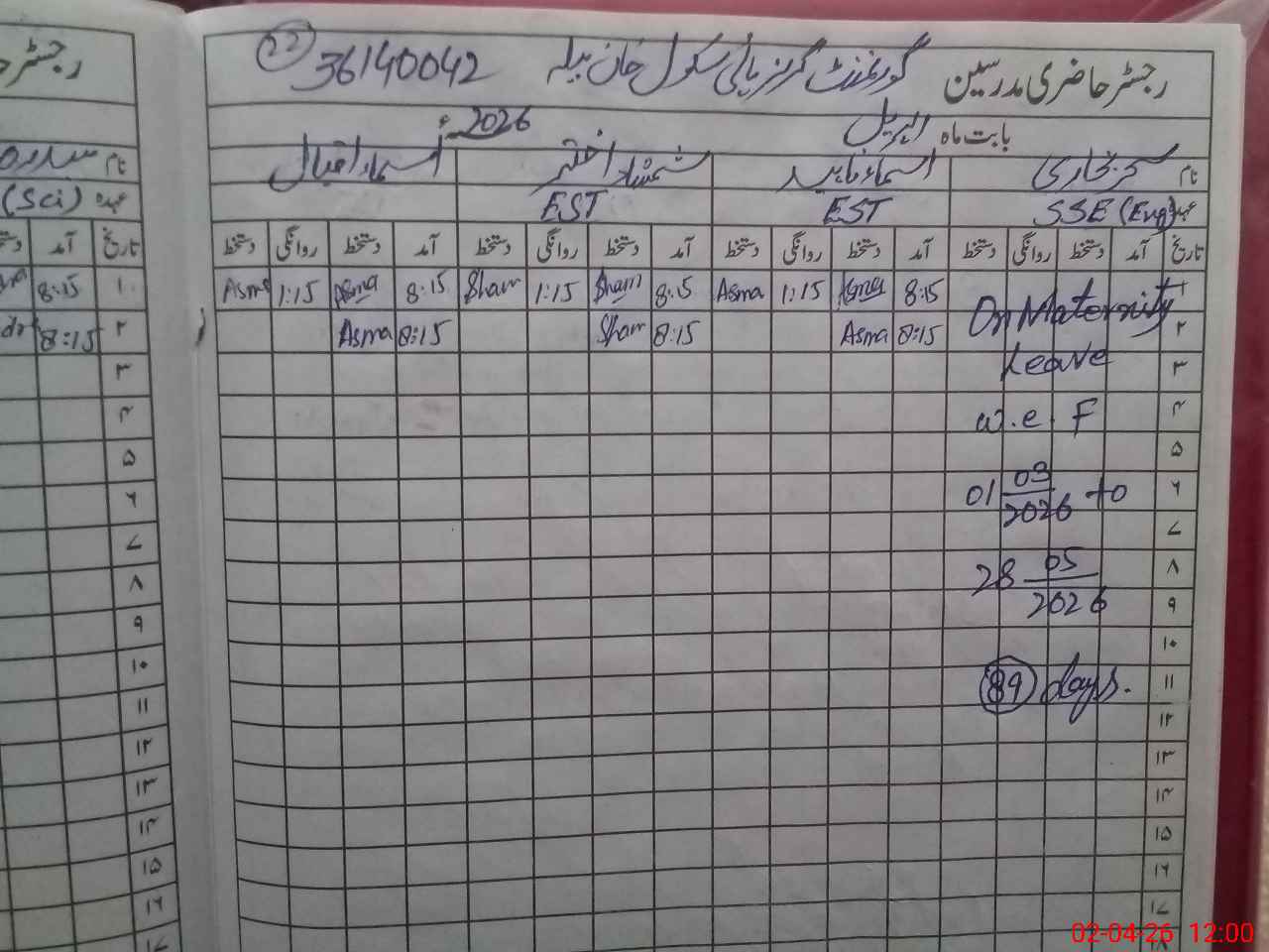 | 36**** | Sa**** Ma**** | PST Science/Maths | Regular | 0 | 0 | 0 | 0 | 0 | 0 | 0 | 0 | 0 | Maternity |