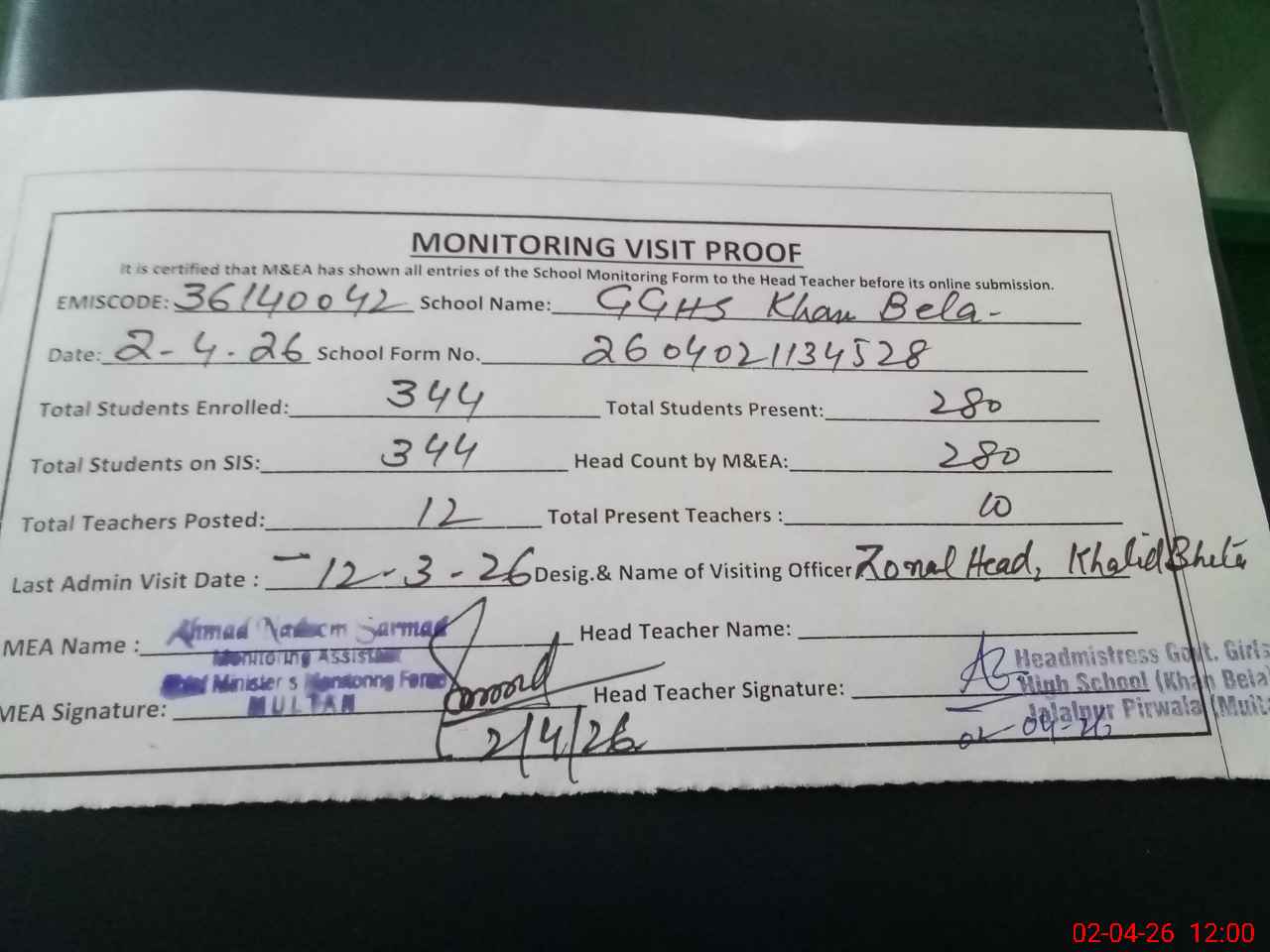 | Attendance Register | Head Teacher | MEA with School | Visit Proof |