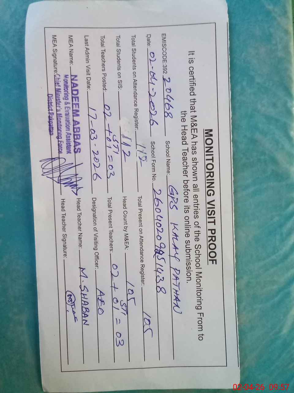 | Attendance Register | Head Teacher | MEA with School | Visit Proof |