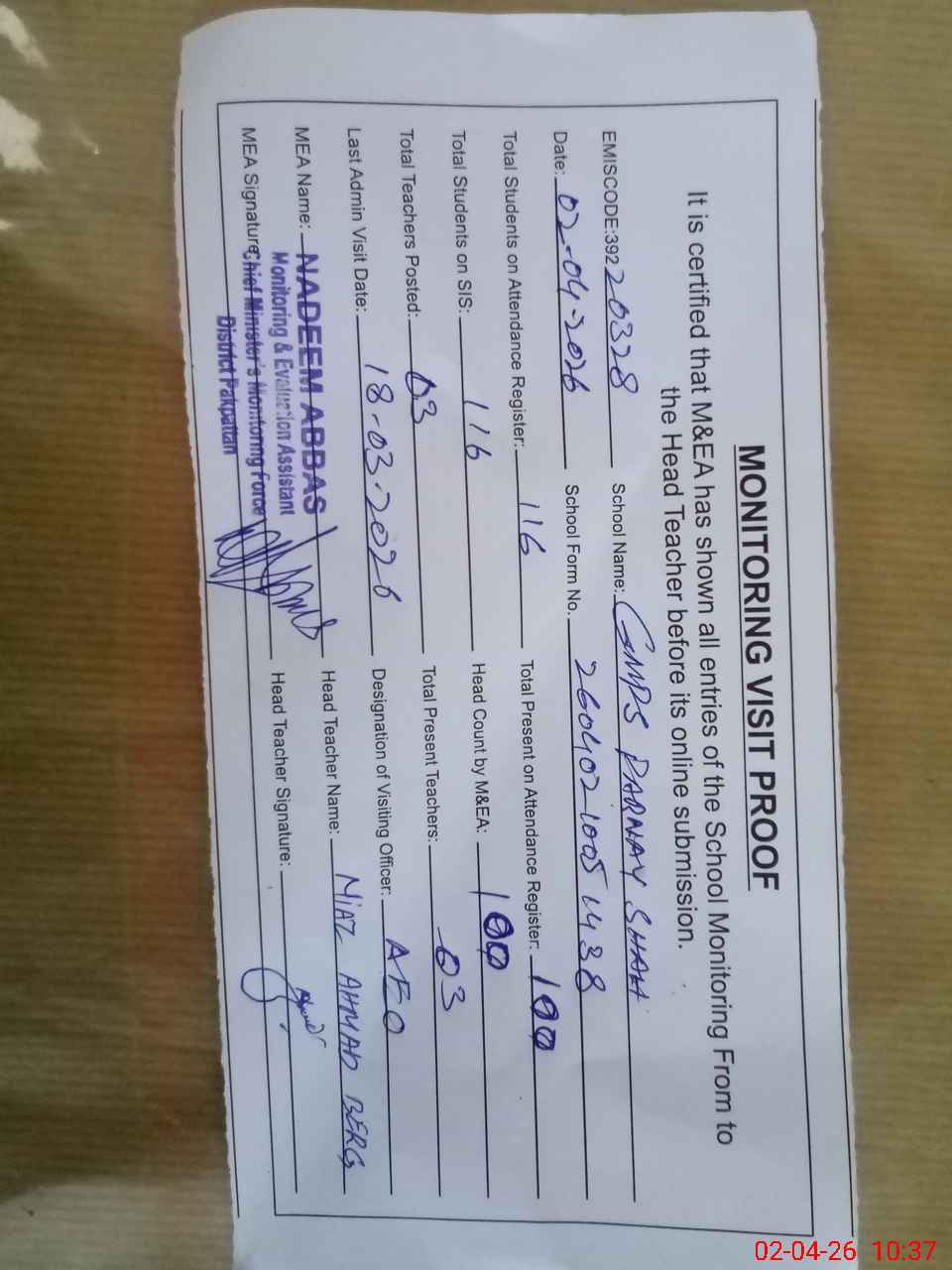 | EMIS Code: 39220328 | Name of School: GMPS PARNAY SHAH PO NOORA RATH ARIF WALA | |||