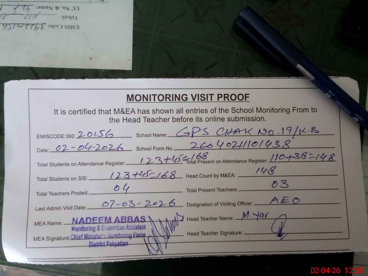 | EMIS Code: 39220156 | Name of School: GPS CHAK NO. 19 KB | |||