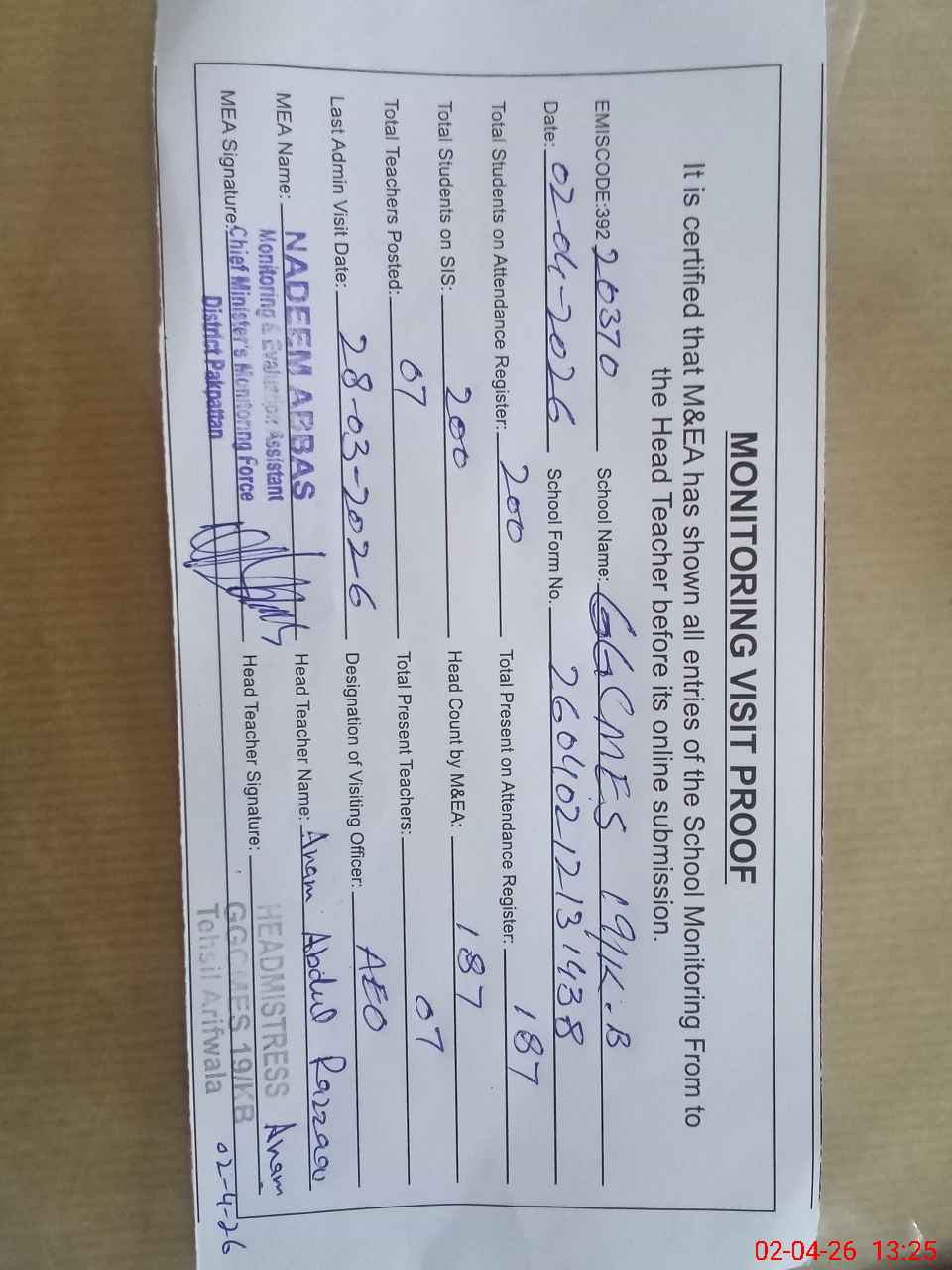 | EMIS Code: 39220370 | Name of School: GGCMES CHAK NO 19 KB | |||
