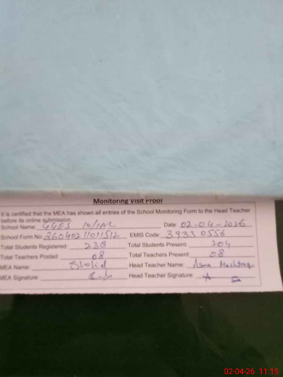 | Attendance Register | Head Teacher | MEA with School | Visit Proof |