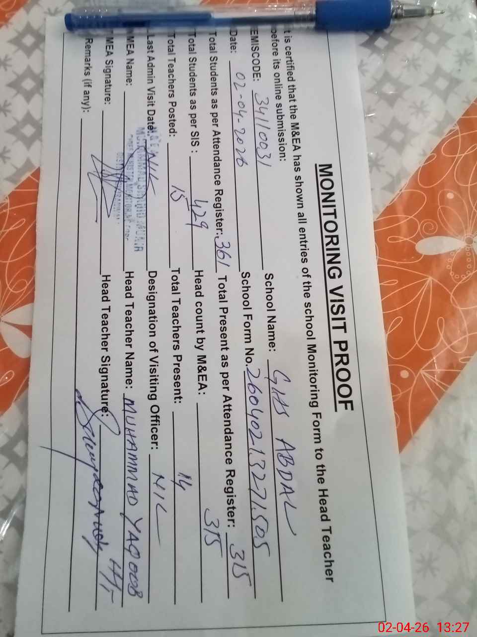 | EMIS Code: 34110031 | Name of School: GHS ABDAL | |||
