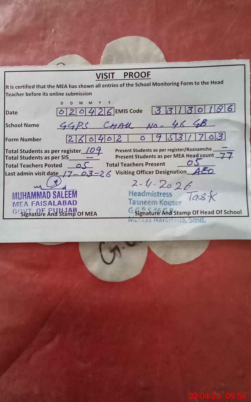 | EMIS Code: 33130186 | Name of School: GGPS CHAK 46 GB SAMUNDRI | |||