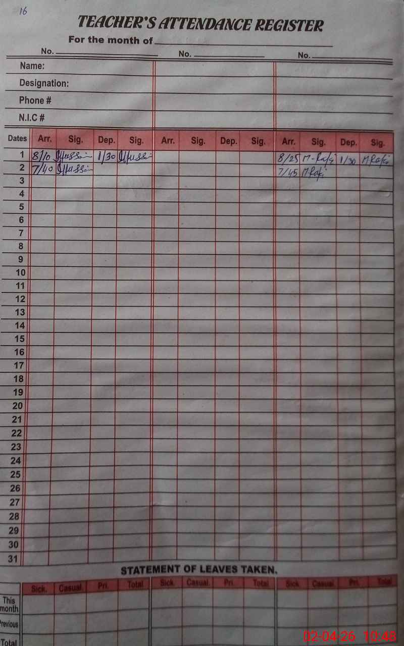 | CNIC | Full Name | Designation | R/C | Absence During Last Calender Month |
