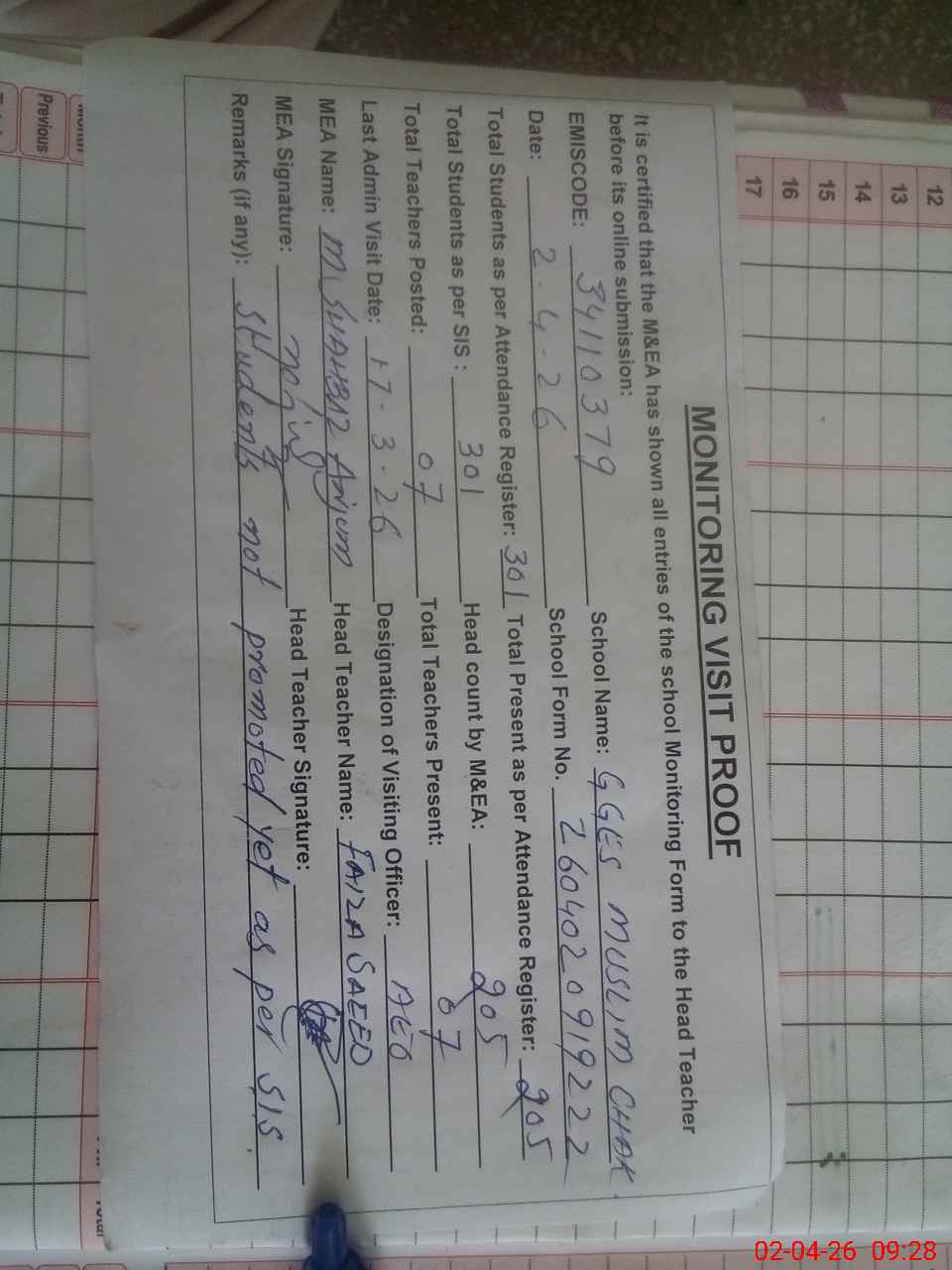 | EMIS Code: 34110379 | Name of School: GGES MUSLIM CHAK | |||