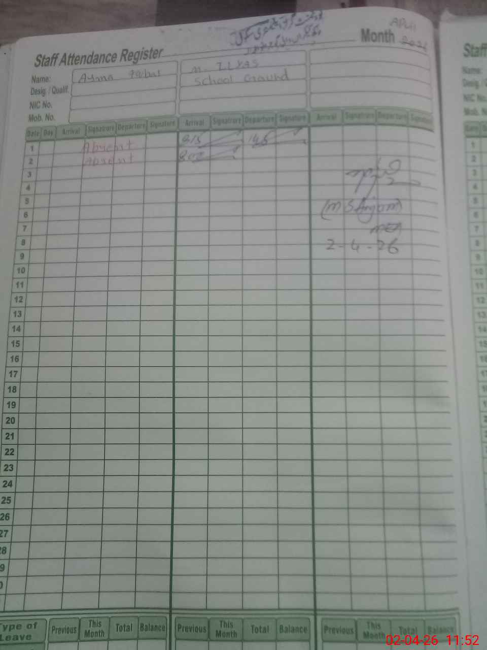 | 34**** | At**** Ra**** | ESE (Arts) | Contract | 0 | 0 | 0 | 0 | 0 | 0 | 0 | 0 | 0 | Absent (Un-Authorized) |