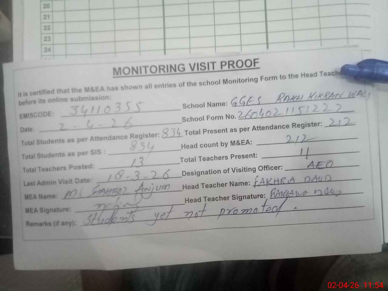 | Attendance Register | Head Teacher | MEA with School | Visit Proof |