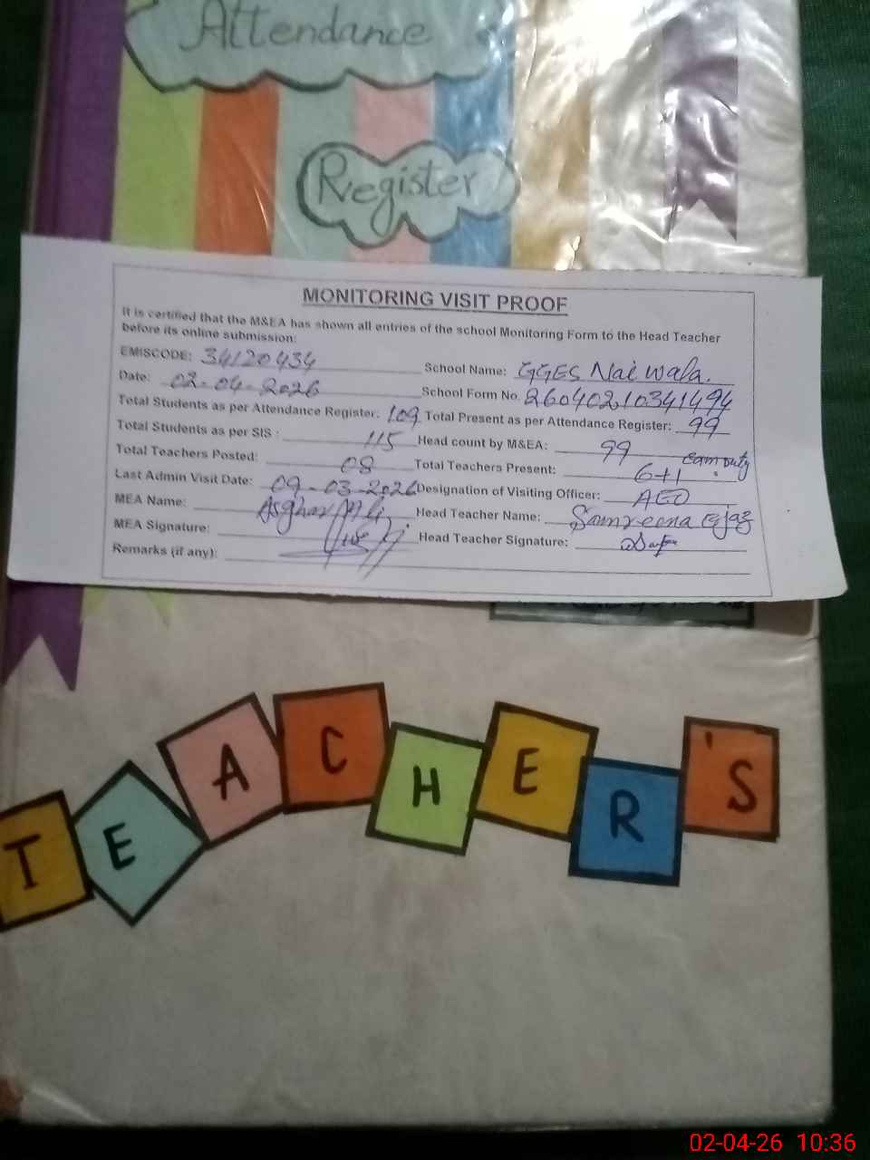 | Attendance Register | Head Teacher | MEA with School | Visit Proof |