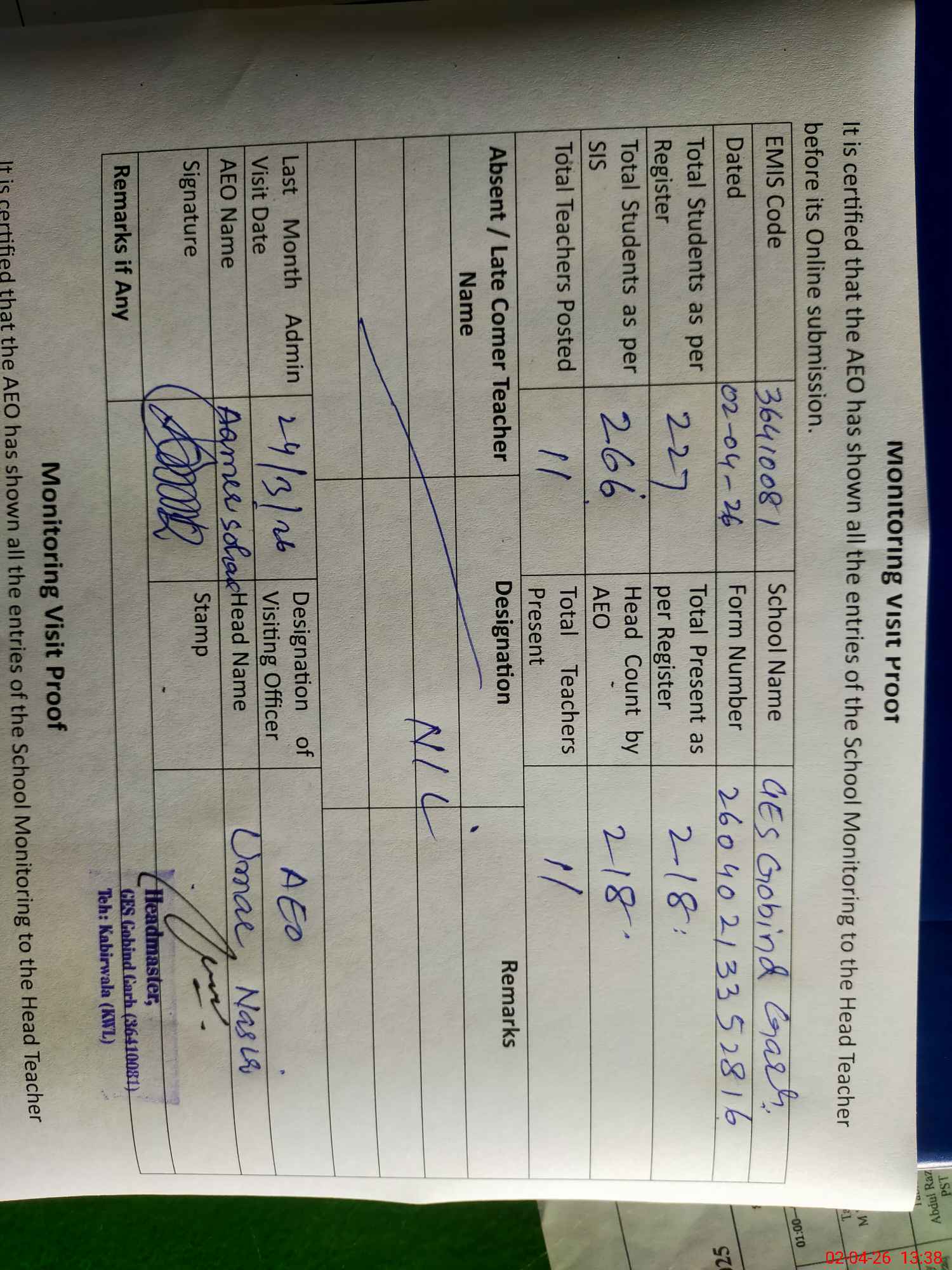 | Certified that this School was Inspected by the Undersigned MEA/DMO Today and the Information Stated Above is as Per Record. | |||||