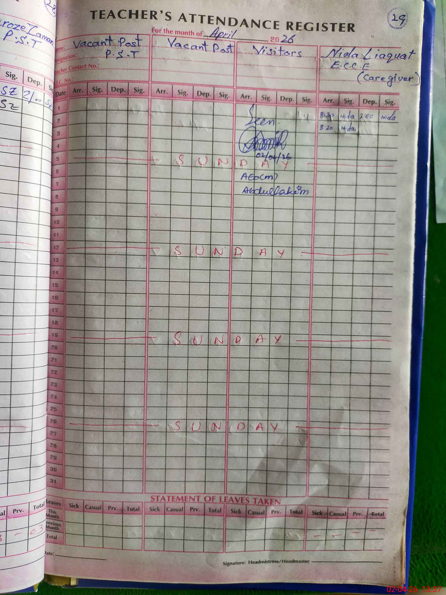 | Attendance Register | Head Teacher | MEA with School | Visit Proof |