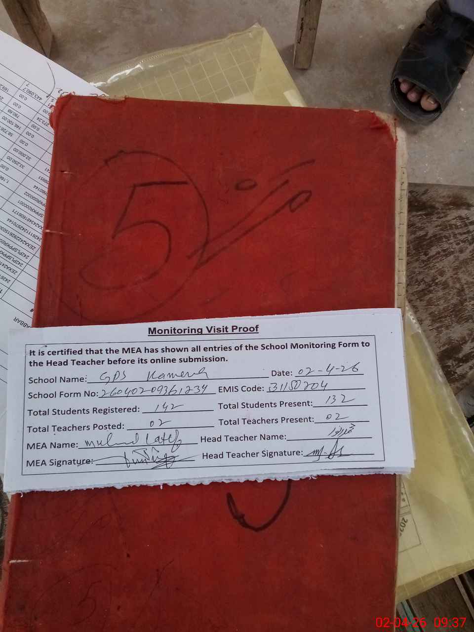 | Attendance Register | Head Teacher | MEA with School | Visit Proof |