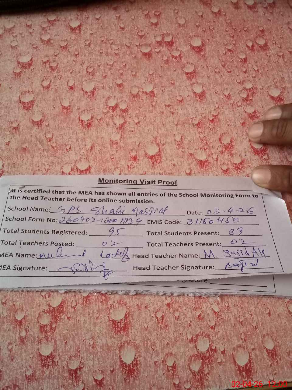 | Attendance Register | Head Teacher | MEA with School | Visit Proof |