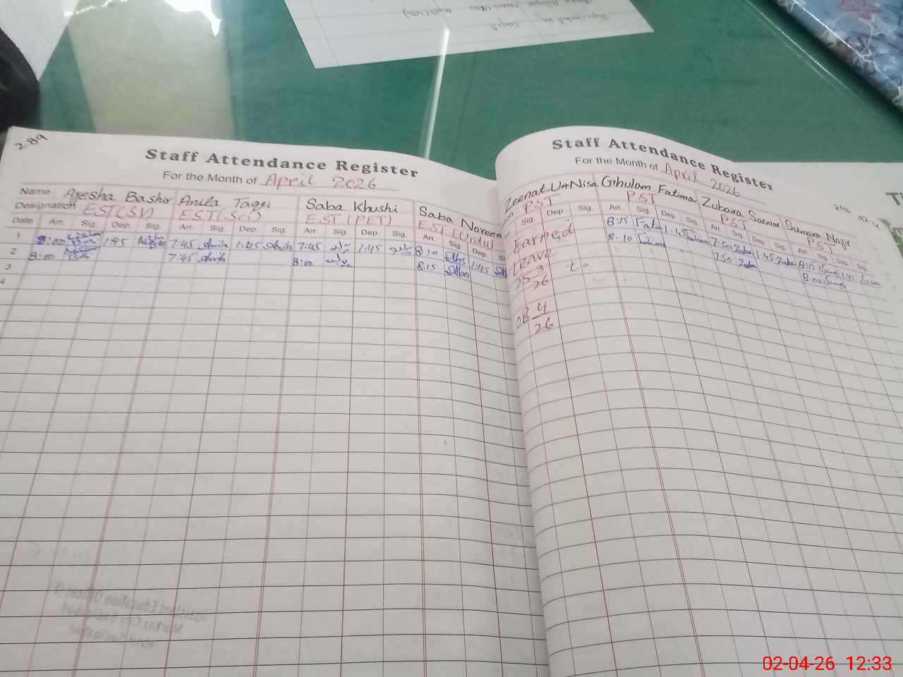 | Remarks (Use Separate Page if Required): zeenat u nisa pst considered as absent her earned leave not approved yet informed to dmo off students books not issued yet schedule in progress | |||||