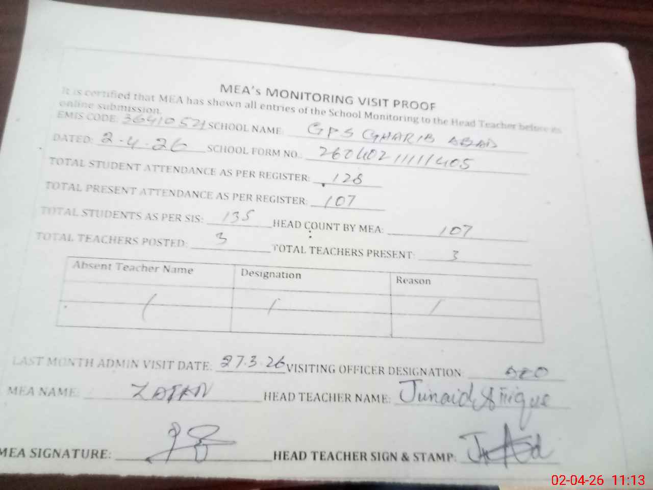 | Attendance Register | Head Teacher | MEA with School | Visit Proof |