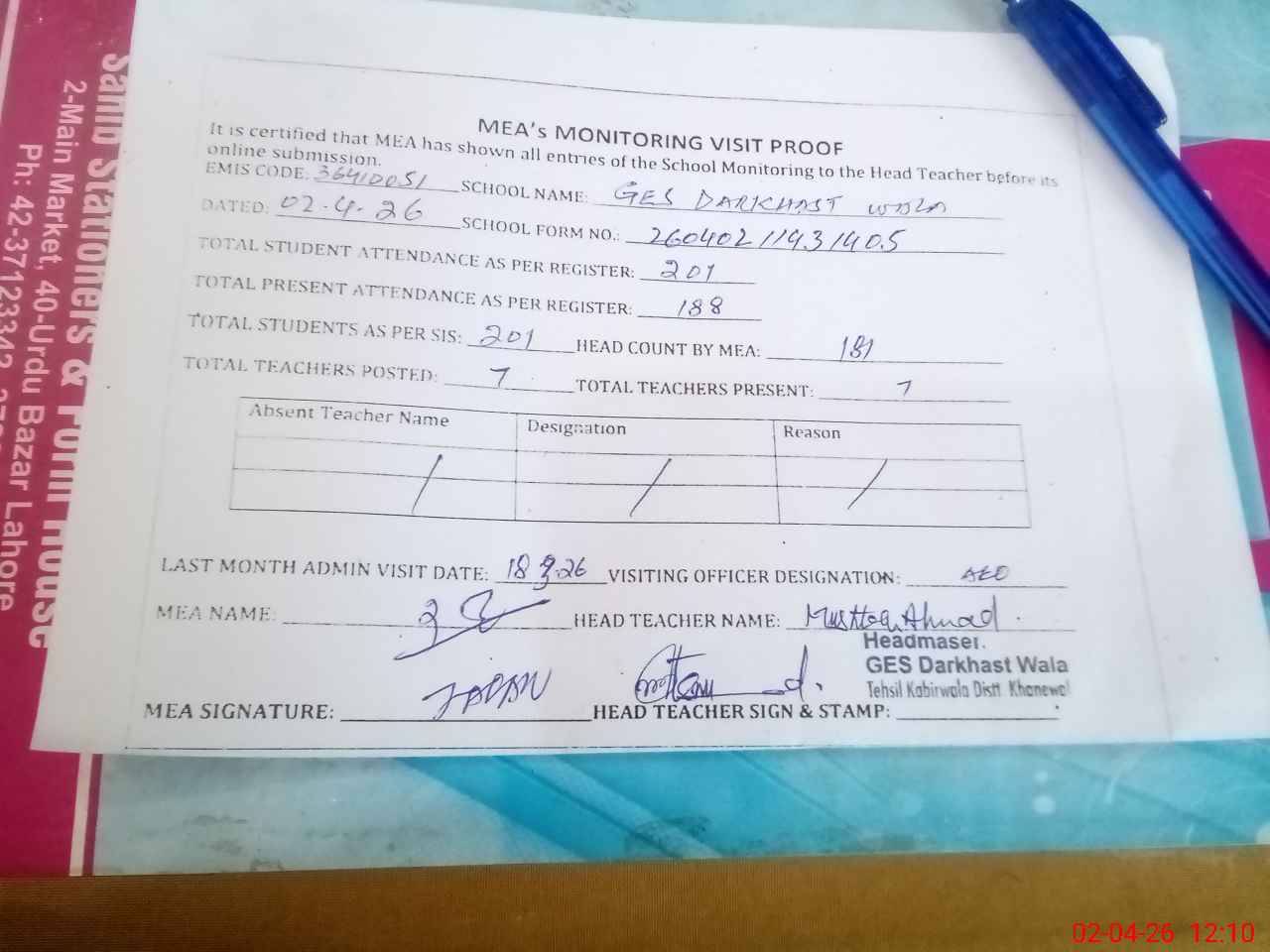 | Attendance Register | Head Teacher | MEA with School | Visit Proof |