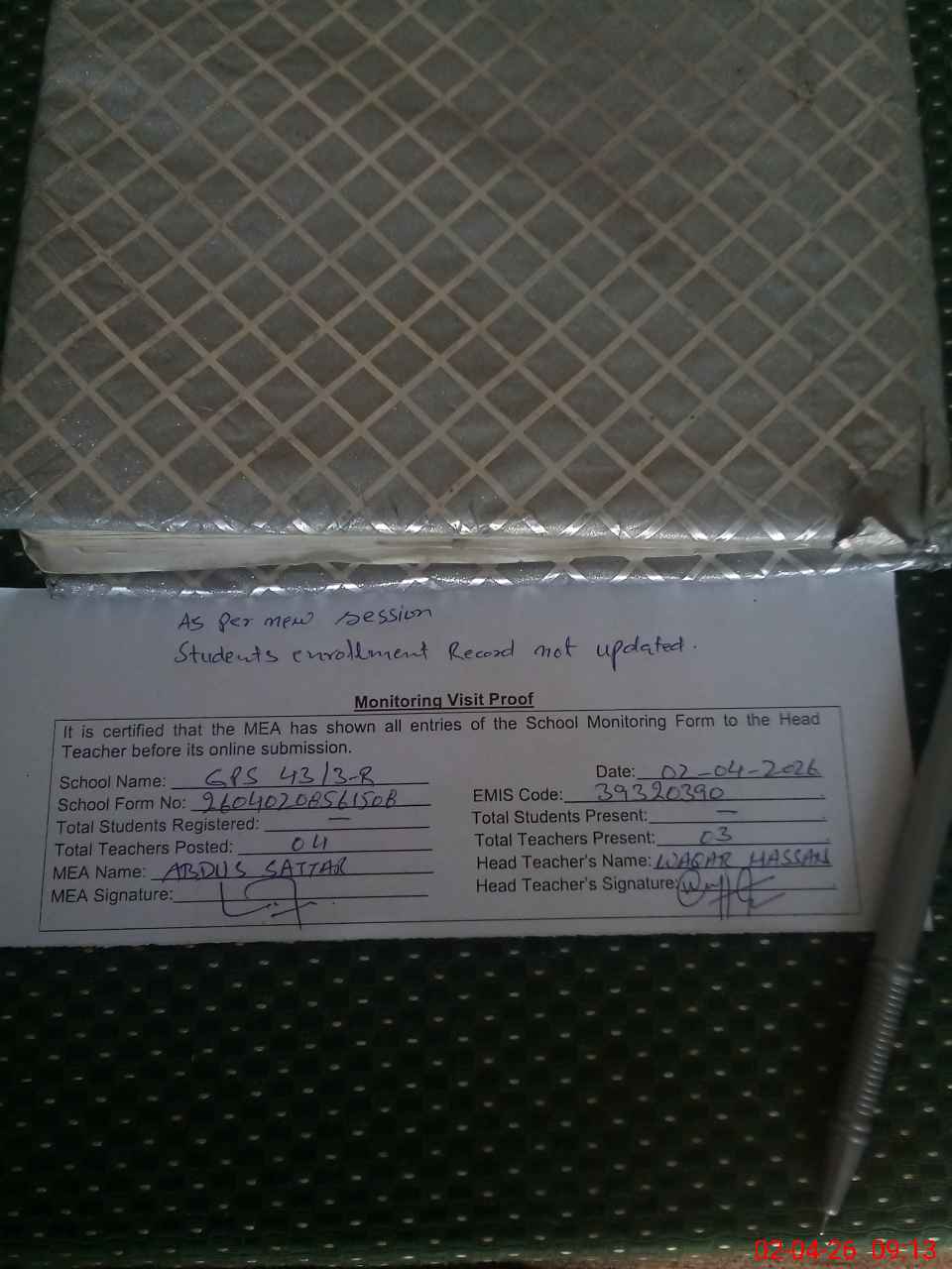 | EMIS Code: 39320390 | Name of School: GPS CHAK NO. 43/ 3-R | |||