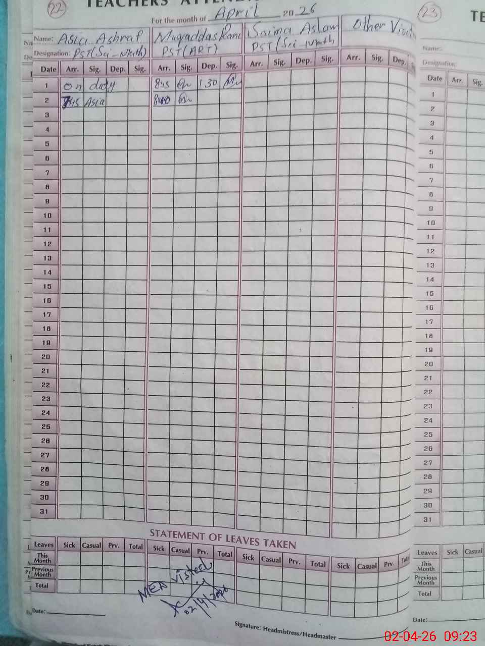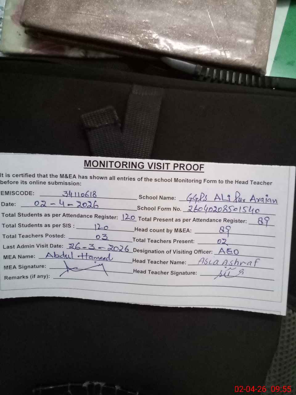 | Attendance Register | Head Teacher | MEA with School | Visit Proof |